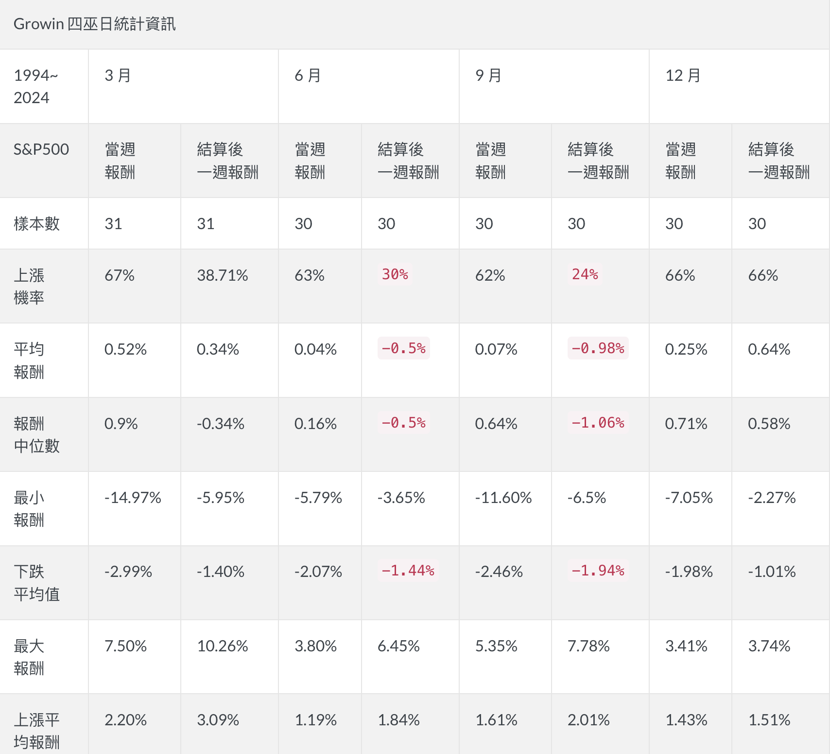 我們統計從 1994 年開始統計至今,四巫日當周、以及之後的一週表現: